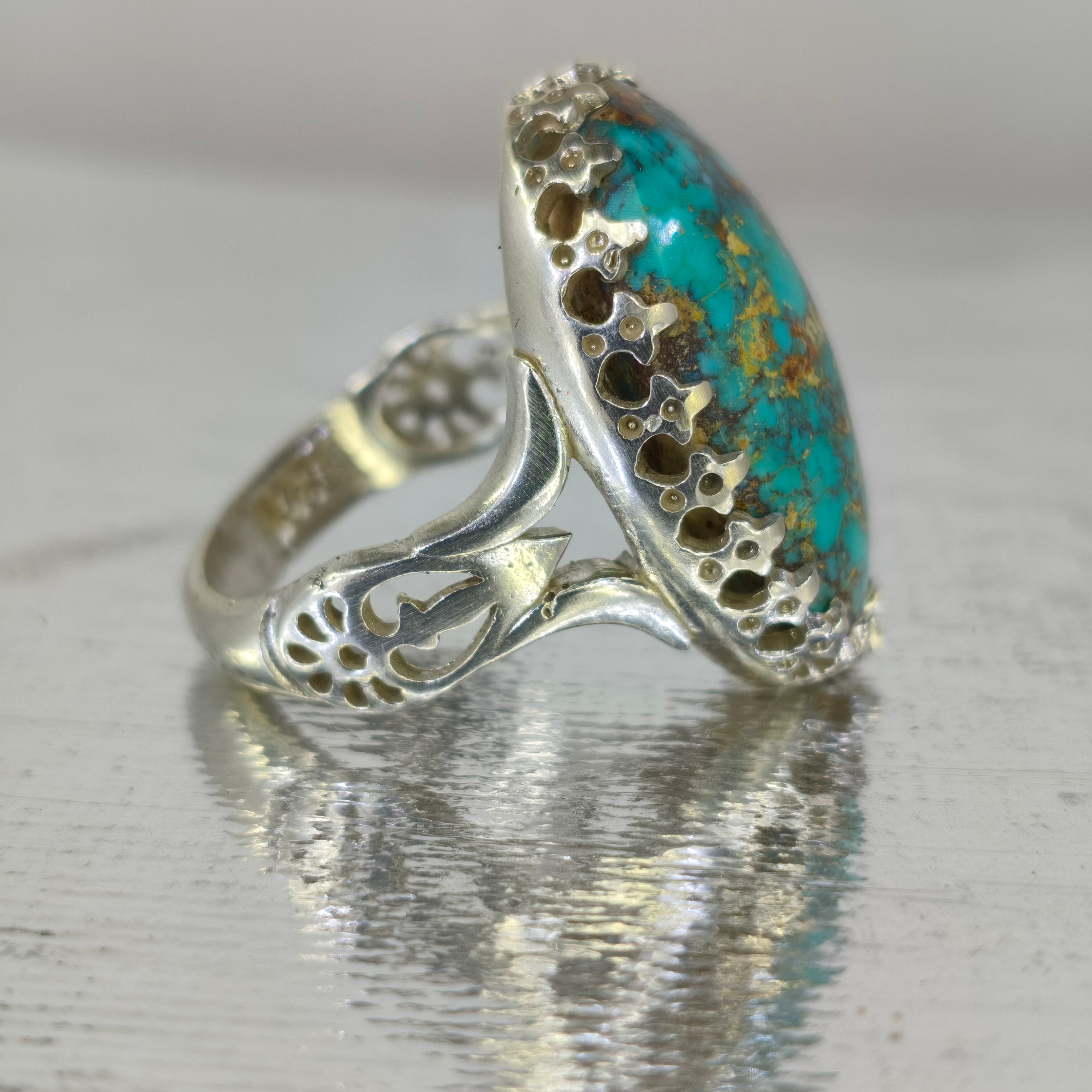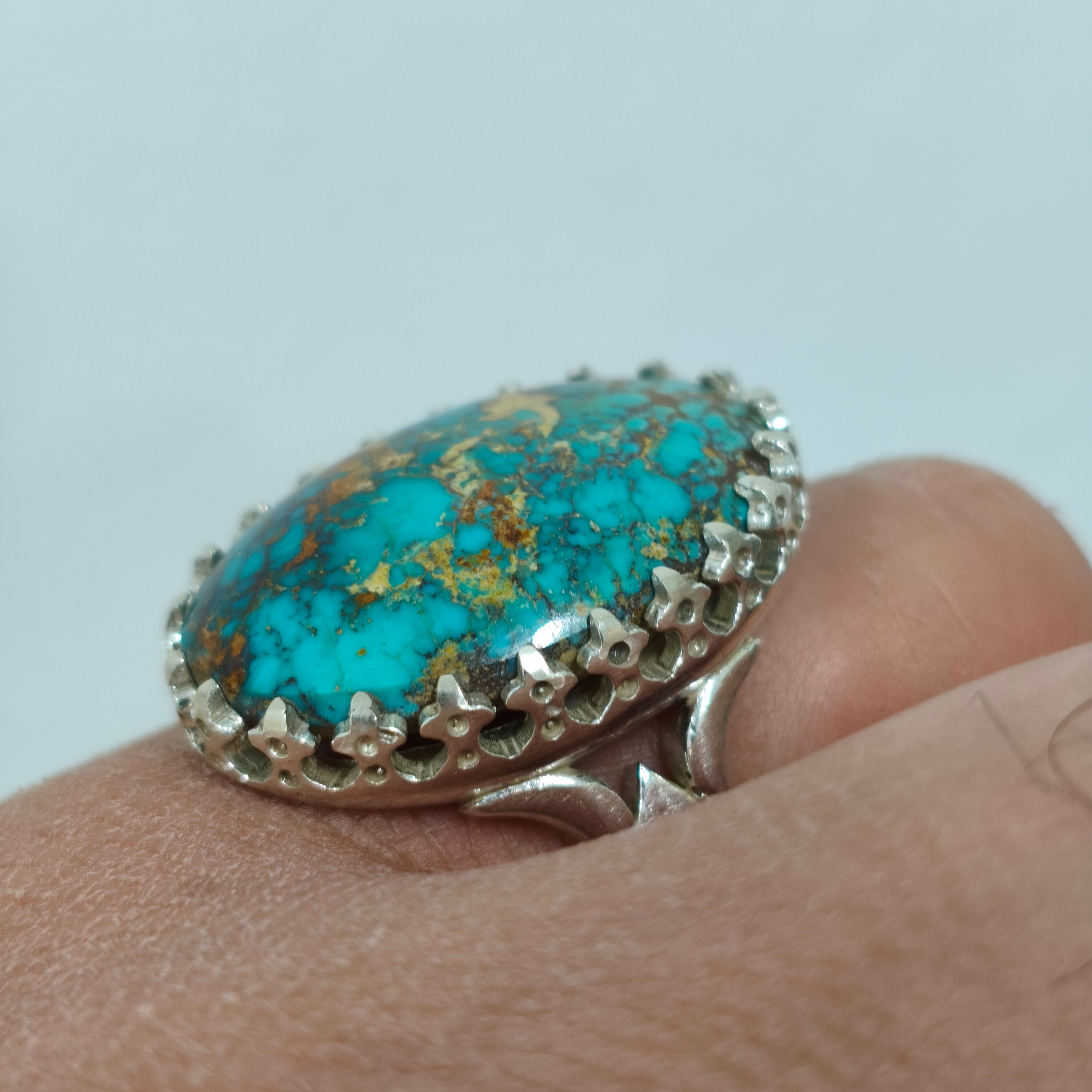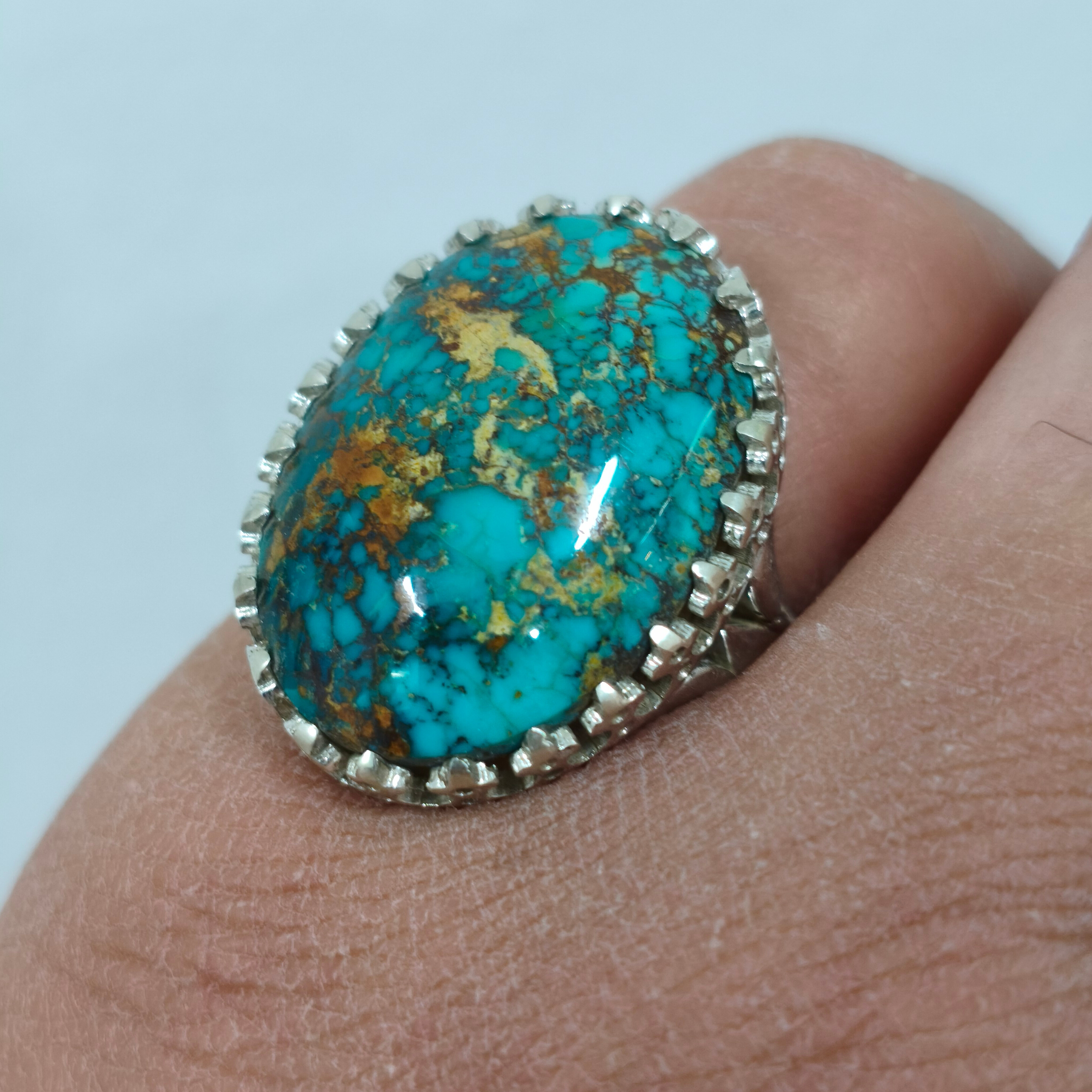 انگشتر فیروزه نیشابوری عنکبوتی رگ طلایی،وزن ۱۳.۱۲ سایز ۶۲-۶۳ رکاب نقره ۹۲۵ طرح صفوی سرنیزهای!! با این انگشتر جادوی اصالت و زیبایی را به دستان خود بیاورید! این انگشتر با رنگ فیروزهای خیرهکننده و رگههای طلایی منحصر به فرد، نه تنها ظاهری جذاب دارد بلکه انرژی مثبت را به زندگی شما هدیه میکند. همین حالا این جواهر ارزشمند را به کالکشن شخصیتان اضافه کنید و از جلوهای بینظیر لذت ببرید.