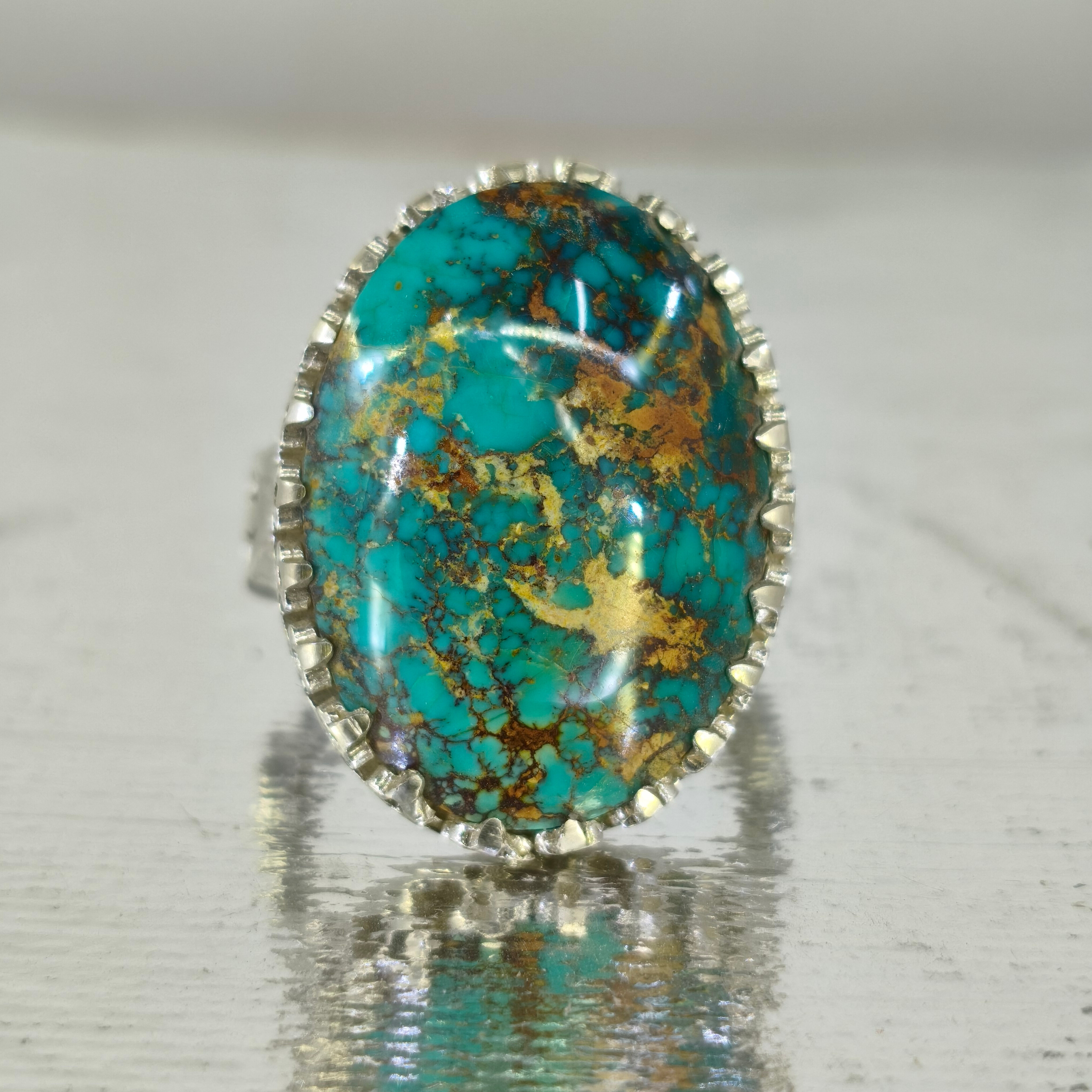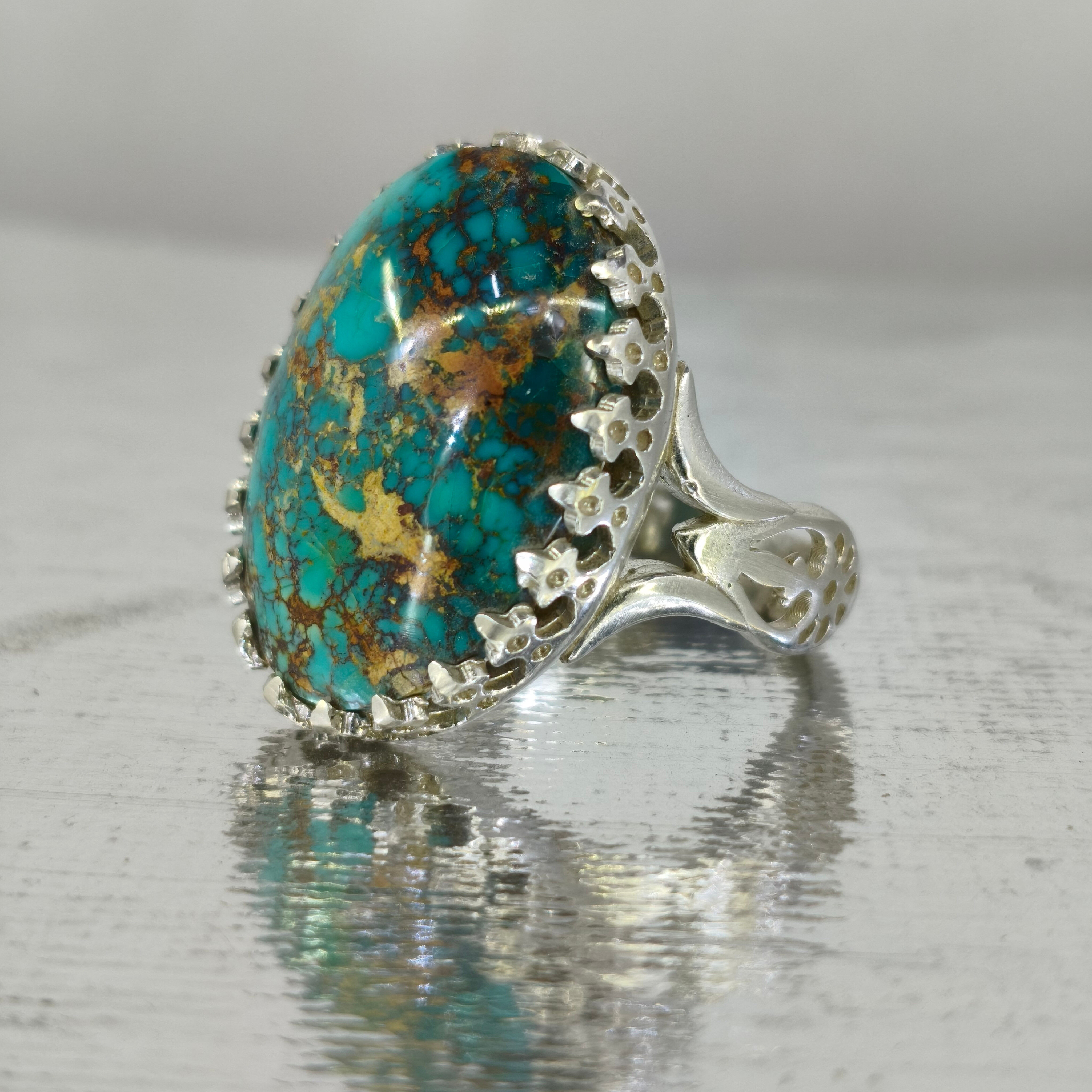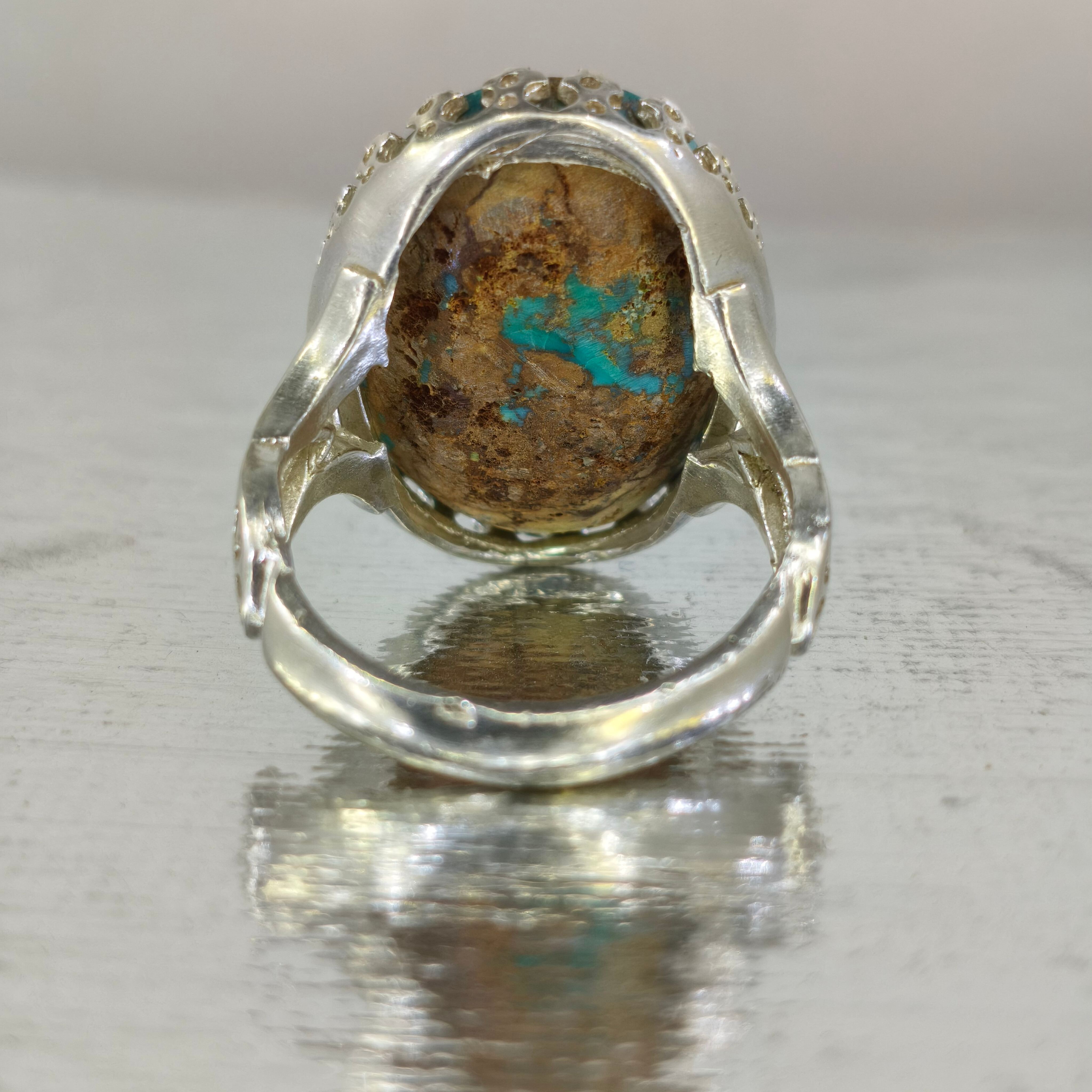 انگشتر فیروزه نیشابوری عنکبوتی رگ طلایی،وزن ۱۳.۱۲ سایز ۶۲-۶۳ رکاب نقره ۹۲۵ طرح صفوی سرنیزهای!! با این انگشتر جادوی اصالت و زیبایی را به دستان خود بیاورید! این انگشتر با رنگ فیروزهای خیرهکننده و رگههای طلایی منحصر به فرد، نه تنها ظاهری جذاب دارد بلکه انرژی مثبت را به زندگی شما هدیه میکند. همین حالا این جواهر ارزشمند را به کالکشن شخصیتان اضافه کنید و از جلوهای بینظیر لذت ببرید.